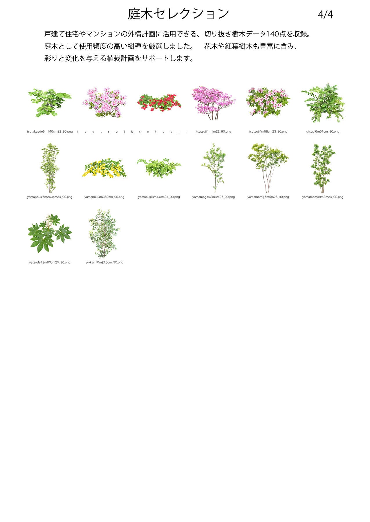 戸建て住宅やマンションの外構計画に活用できる、切り抜き樹木データ140点を収録。